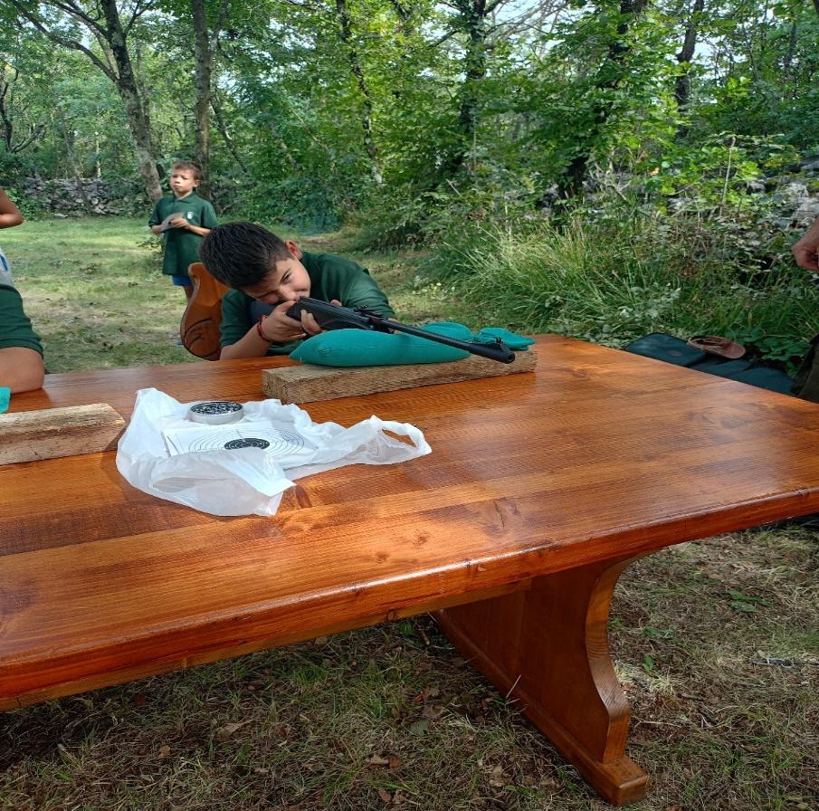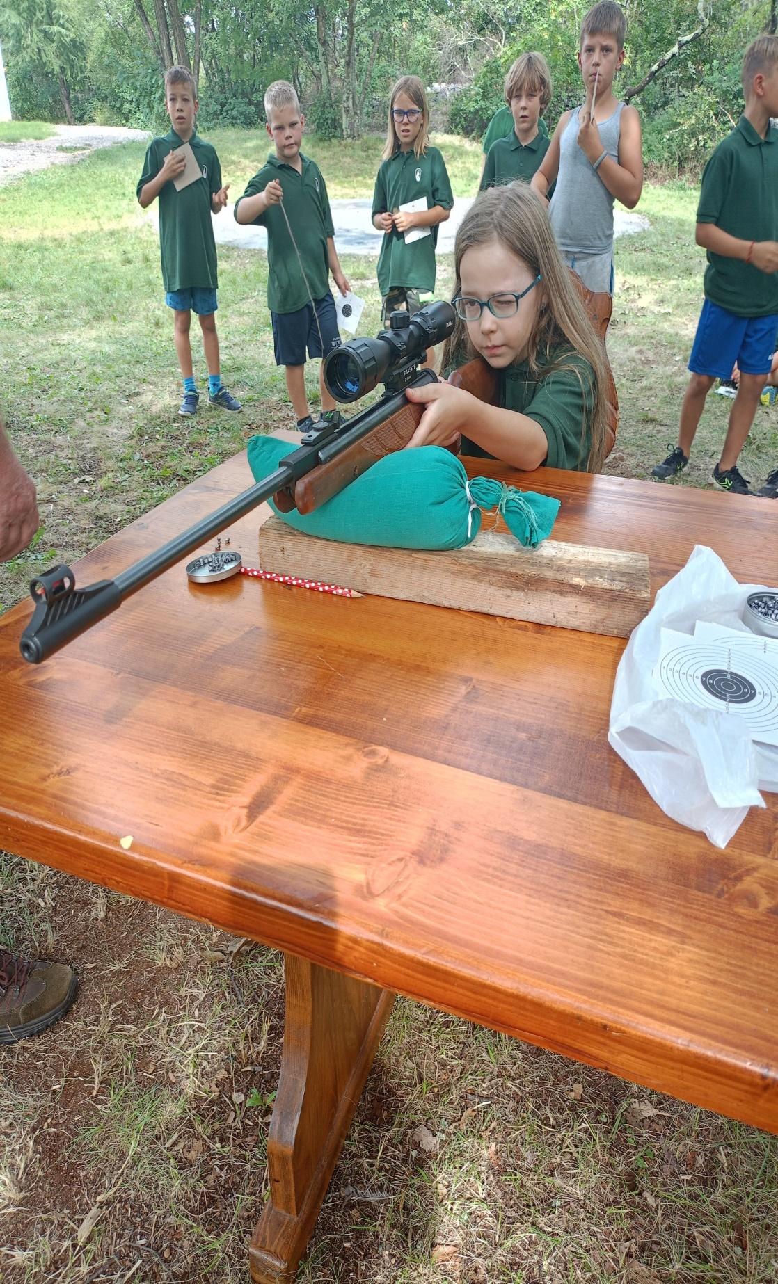 Pod nadzorom lovcev so se preizkusili v streljanju z zračno puško. Od dečkov je bil najboljša Tilen Kosmina in Gal Pipan, s 24-timi pikami, od deklic pa Alma Zotti z 10-timi pikami.